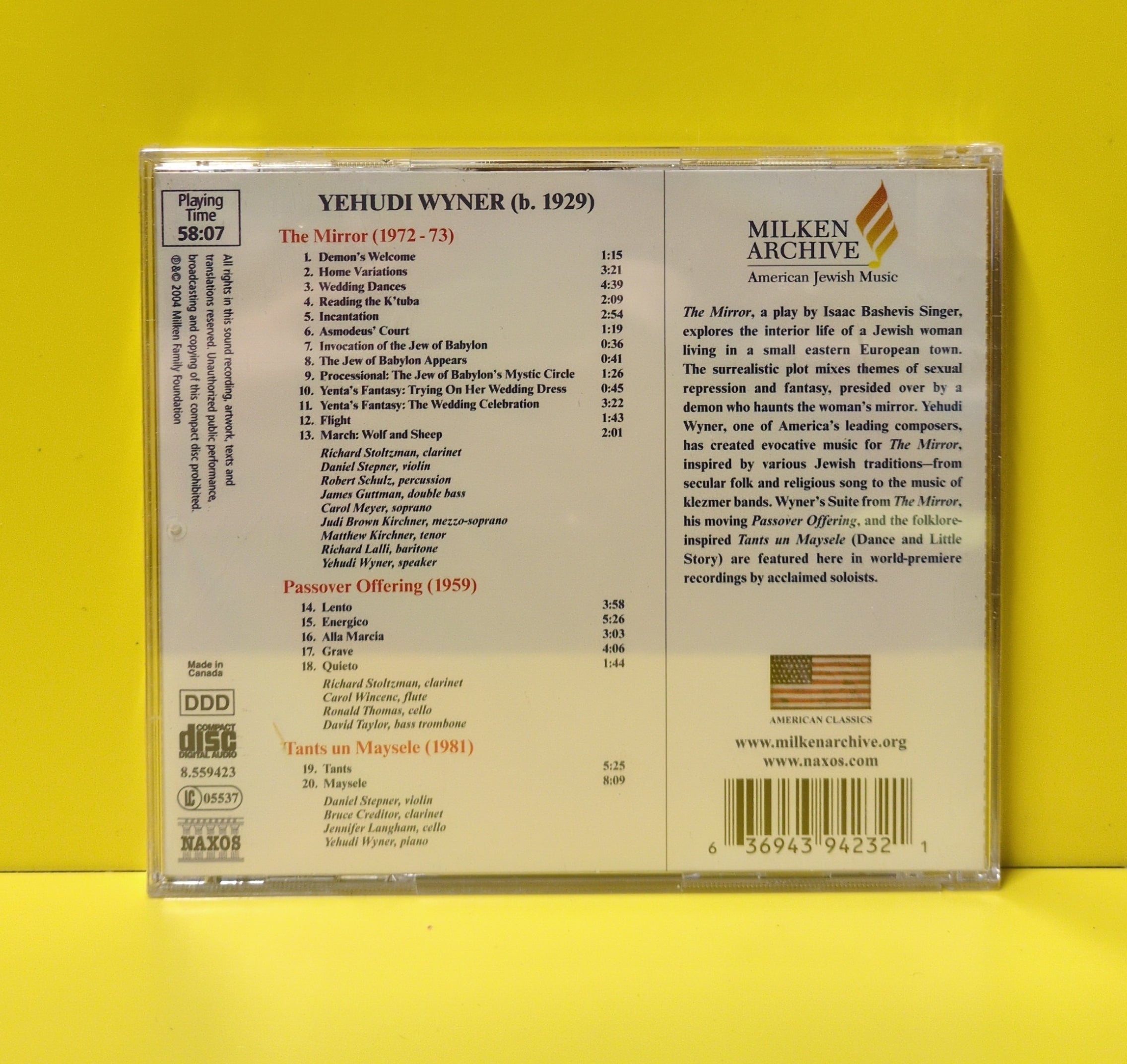 Yehudi Wyner, Richard Stoltzman, Daniel Stepner, Carol Wincene, Ronald Thomas - The Mirror / Passover Offering / Tants Un Maysele - 2004 - 8.559423 New - Sealed - CDs
